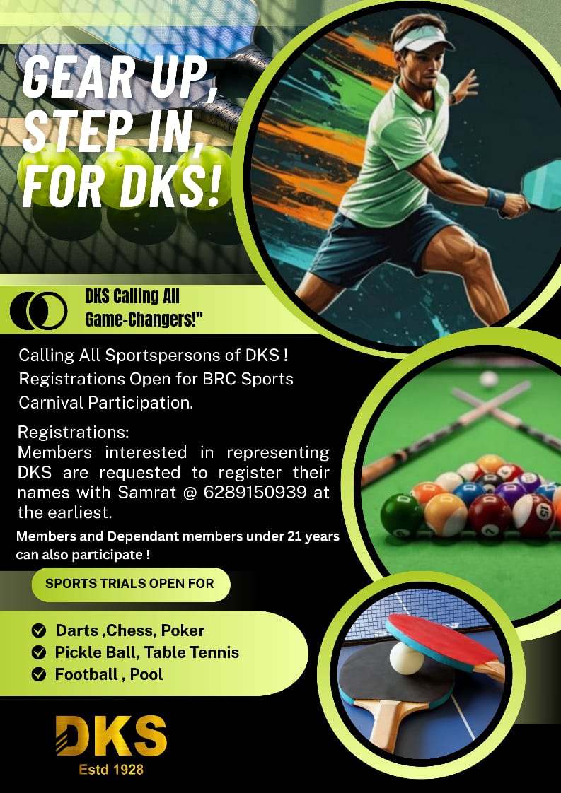 | 2 | Calling All Sportspersons of DKS | Registrations Open for BRC Sports Carnival Participation DKS is gearing up to participate in the upcoming BRC Sports Carnival, and we invite enthusiastic members to represent our Club across a wide range of sporting events. If you have the passion, the skill, and the spirit to compete, this is your opportunity to step forward. Please review the disciplines and categories below and register for the events where you wish to participate. In case of high registrations, selection trials will be conducted next weekend. DARTS * Men’s Singles (21+) * Veteran Mixed Doubles (50+) * Men’s Doubles (21+) * Open Doubles (any age) * Triples (one female and one male compulsory) Max: 15 players CHESS * U-21 (Male/Female) * Above 21 (Male/Female) * Open (any age, Male/Female) * Open Blitz (Male) Max: 8 players per team FOOTBALL * U-21: 2 players * Above 21: 4 players * Veterans 50+: 2 players Max: 10 players PICKLEBALL * Junior Doubles U-21: 3 players * Men’s Open Doubles: 4 players * Split Open Age Doubles (35+/35–): 4 players * Veterans 45+: 3 players * Women’s Doubles: 3 players POKER * 2 Female players * 2 Male players POOL * 7 players (including minimum 2 Female players) TABLE TENNIS * Men’s Singles (21+) * Men’s Doubles (21+) * Veteran Doubles (45+) * Junior Doubles (U-21) * Mixed Doubles (Male 21+, Female any age) Max: 12 players Registrations: Members interested in representing DKS are requested to register their names with Samrat @ 6289150939 at the earliest.Trials to take place this weekend . Let us come together, showcase our talent, and make DKS proud at the BRC Sports Carnival. Your participation and sporting spirit will make all the difference. | 24/11/2025 | View |