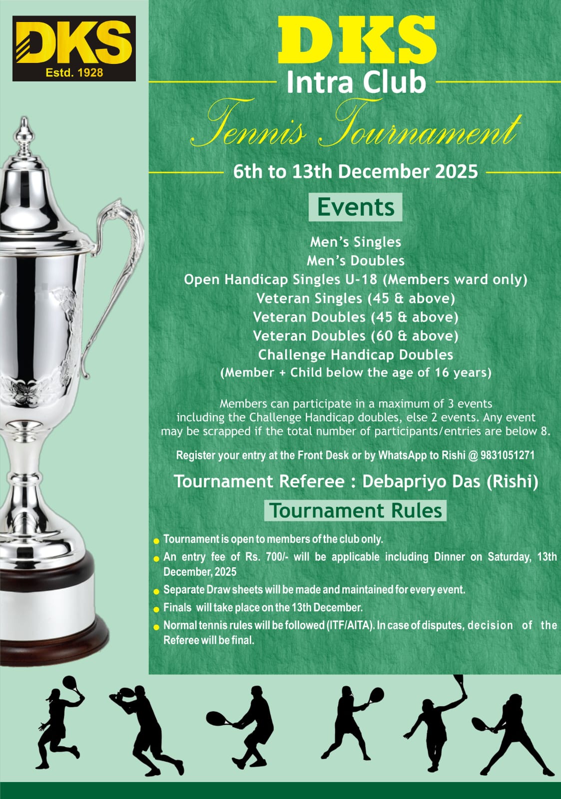 | 1 | DKS INTRA CLUB TENNIS TOURNAMENT 6TH TO 13TH DECEMBER 2025 | . | 25/11/2025 | View |