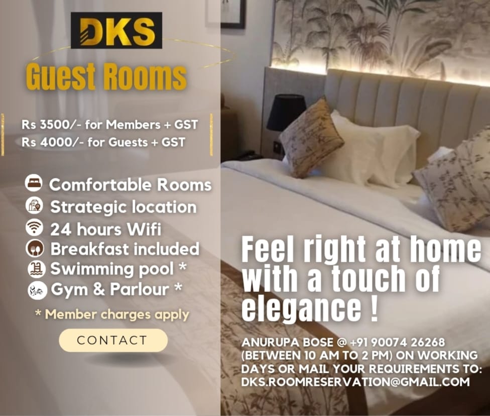 | 2 | Experience Luxury and Comfort | DKS is delighted to offer seven elegantly designed Guest Rooms in its new wing, available exclusively for our Members, their Guests. All the rooms are thoughtfully furnished with modern amenities to ensure a comfortable and relaxing stay, whether one is visiting for leisure or on a special occasion. With a blend of style, comfort, and convenience, these Guest Rooms reflect the hospitality and excellence that DKS is known for. Reservation & Room Tariffs: Member Rs 3500/- +Gst Guests Rs 4000/- + Gst (With Breakfast) Call on Anurupa Bose @ +91 90074 26268 (Between 10 AM to 2 PM) on working days or mail your requirements to: dks.roomreservation@gmail.com We Look forward to hosting you in our DKS Guests Rooms, designed to make your stay truly unforgettable. | 15/12/2025 | View |